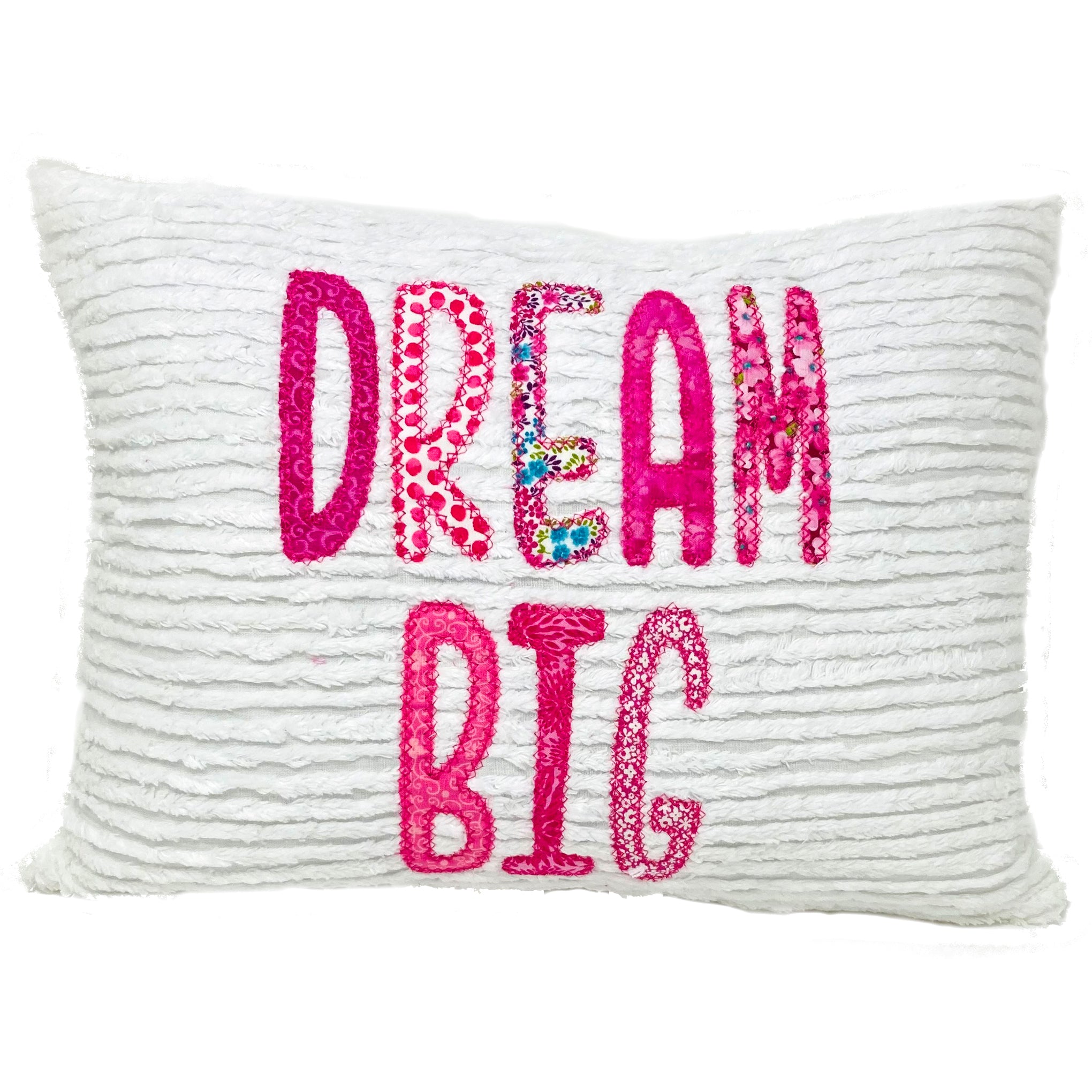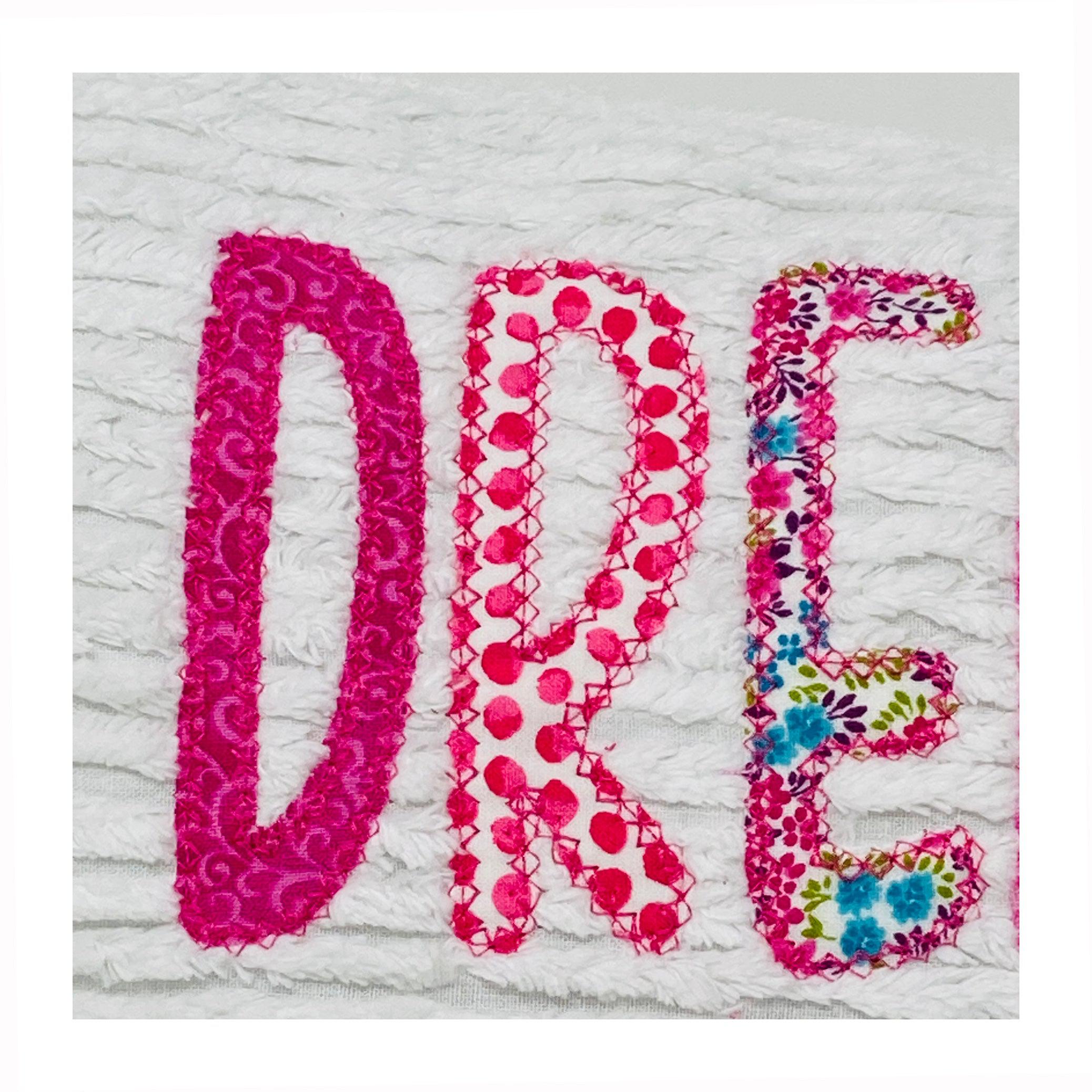 This pretty applique pillow is made with white chenille  fabric and multiple pink applique fabrics. Note -  The applique fabrics may vary due to availability.
