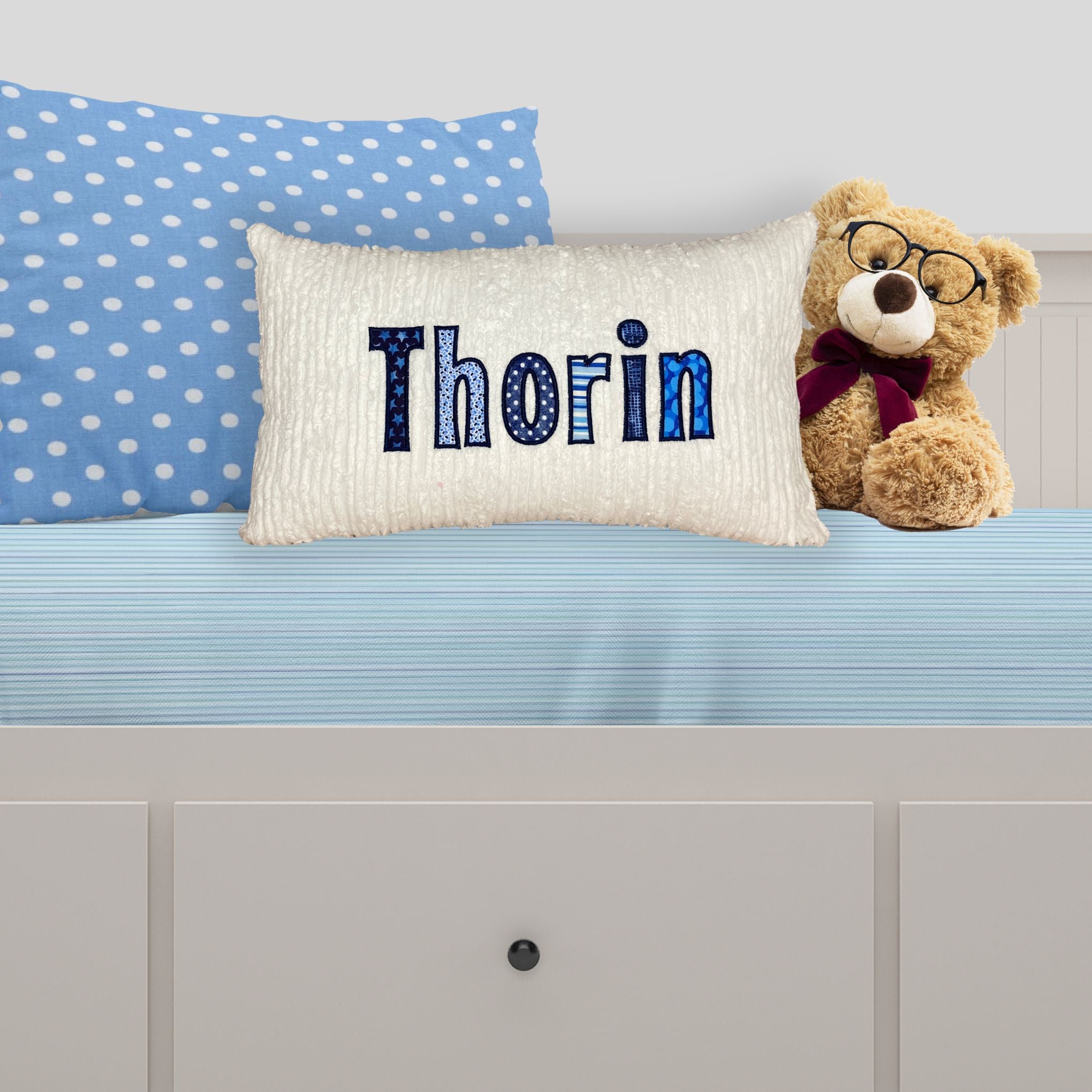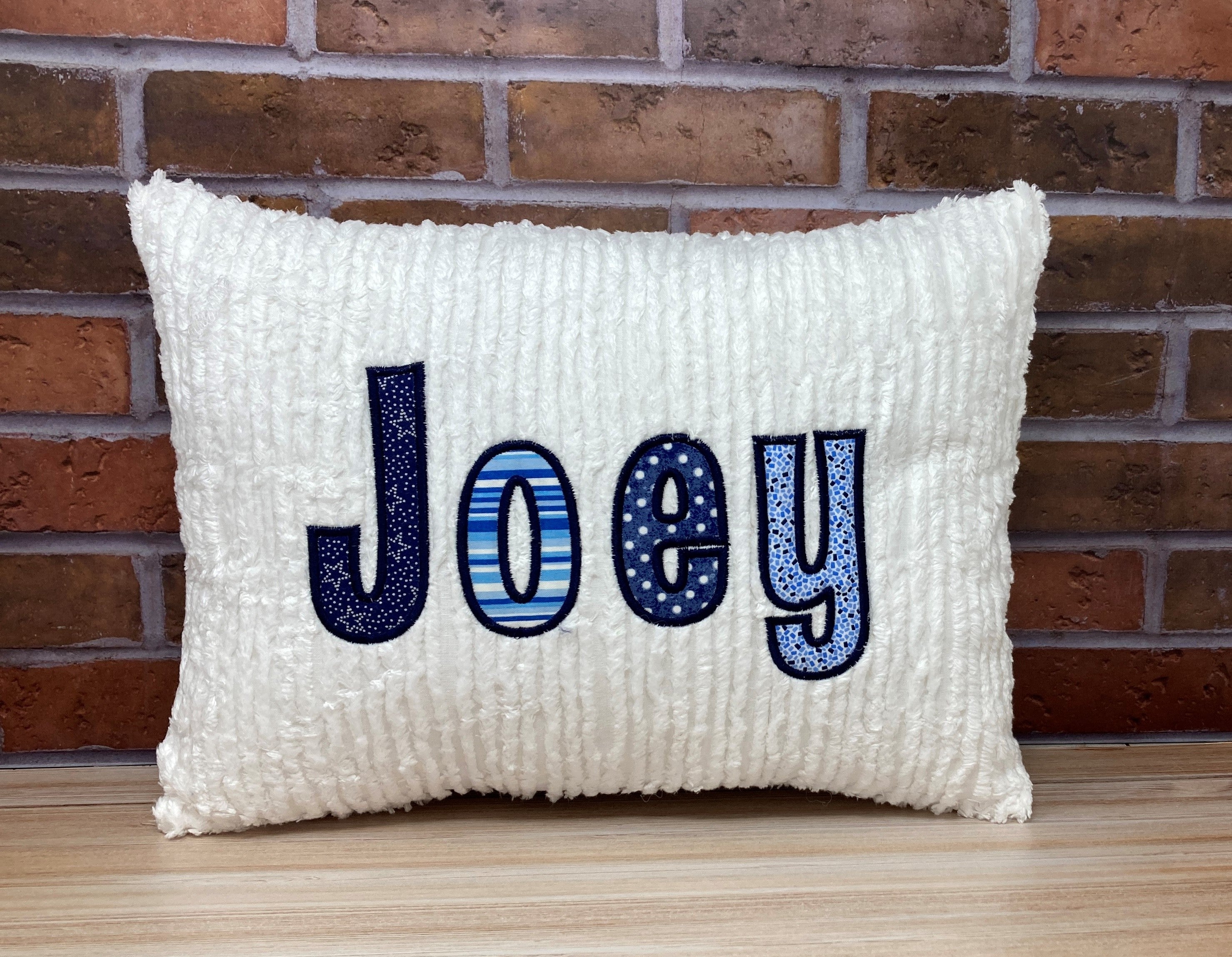 This pretty personalized pillow is made with soft chenille fabric. The name is appliqued with a variety of navy and blue fabrics (may change slightly from listing photo due to availability). Your special boy will love it!!