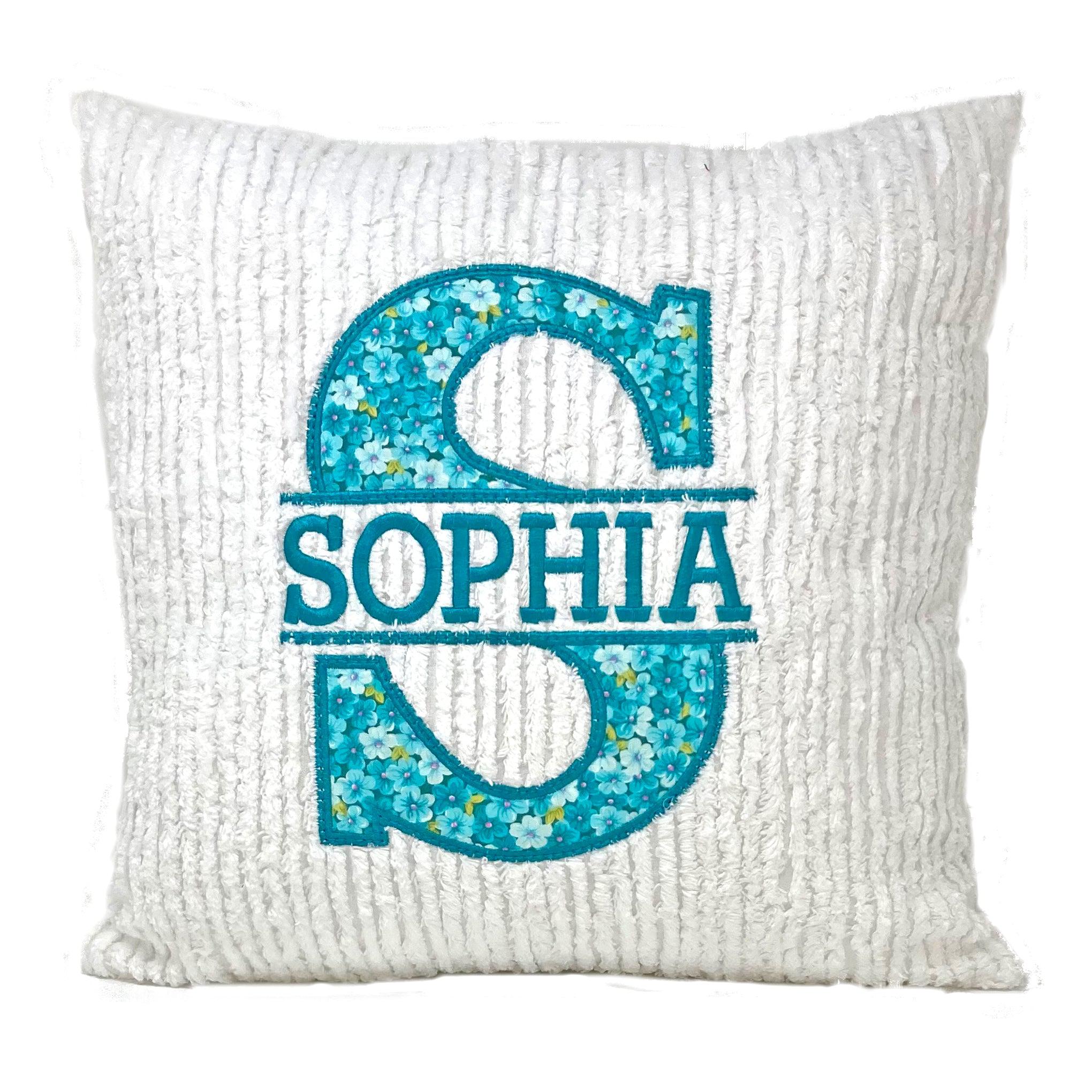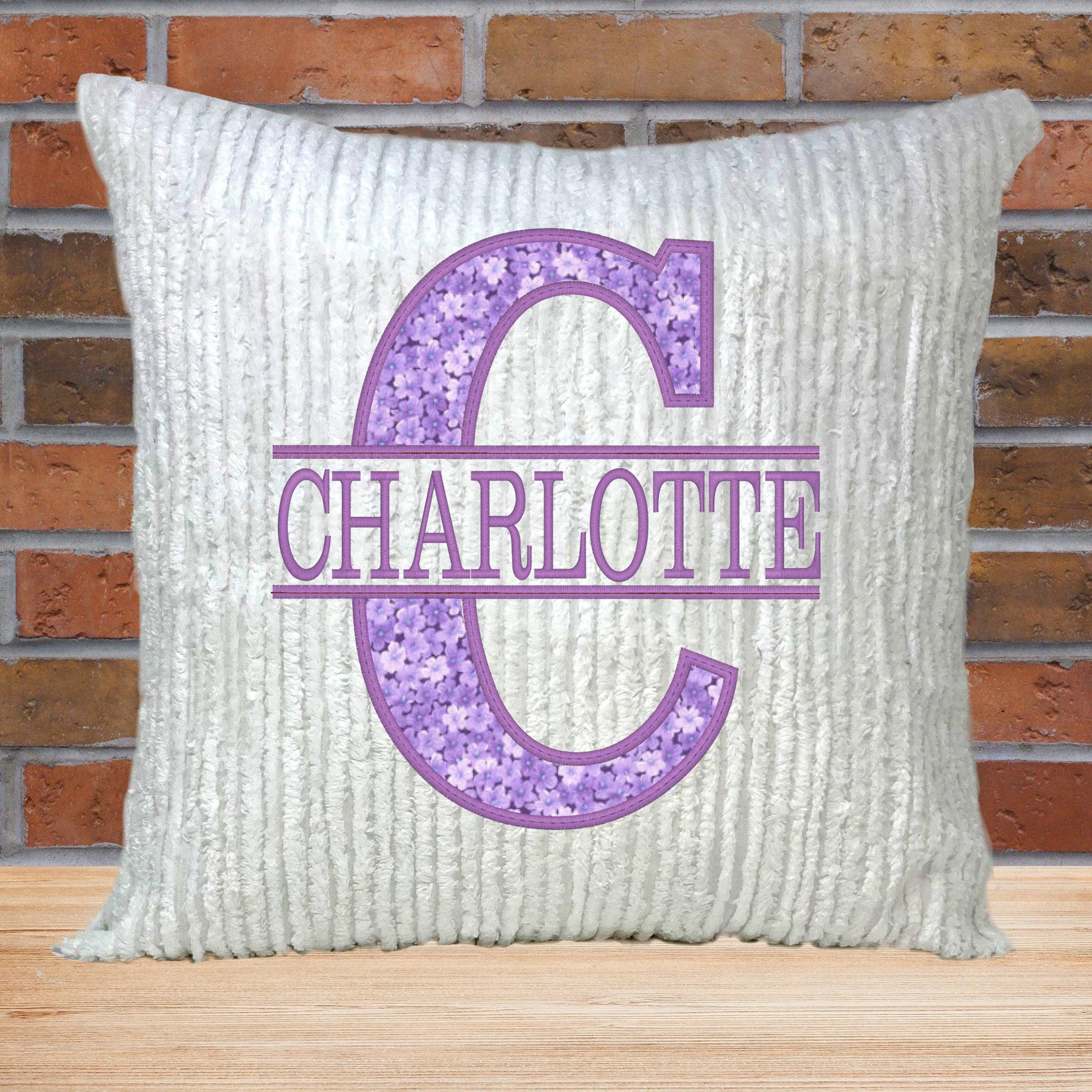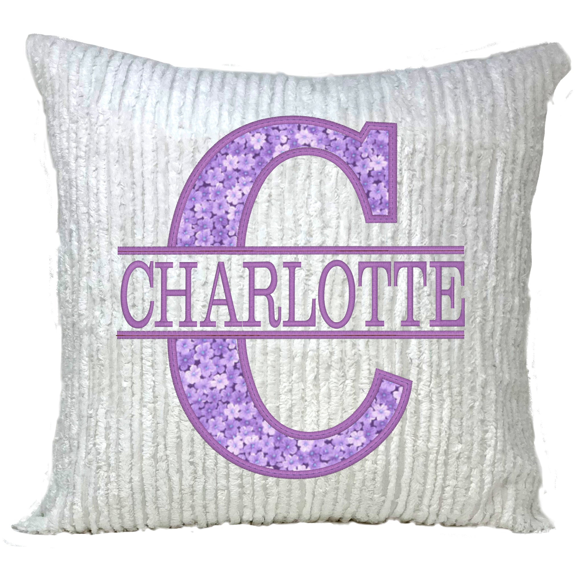 This pretty personalized pillow is made with soft chenille fabric. The initial is appliqued using a lavender print fabric. Girls of any age will love it!!