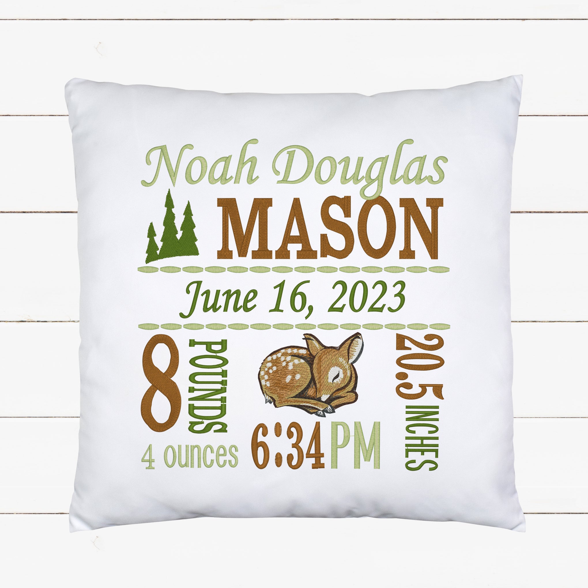 New parents will love this beautiful birth announcement pillow using woodland colors and pine tree and baby deer accents. The pillow is custom made with your choice of colors and accent (small accent design). The design is machine embroidered. Your pillow will be one of a kind - and I will work with you to ensure it is exactly what you want. Up to two revisions are included in the price,