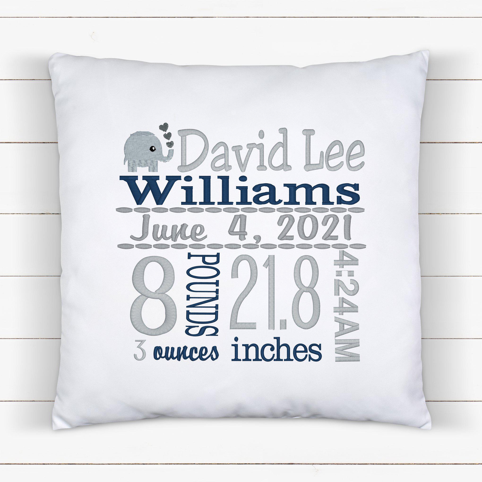 Personalized Birth Statistics Pillow - Embroidered Baby Elephant Design