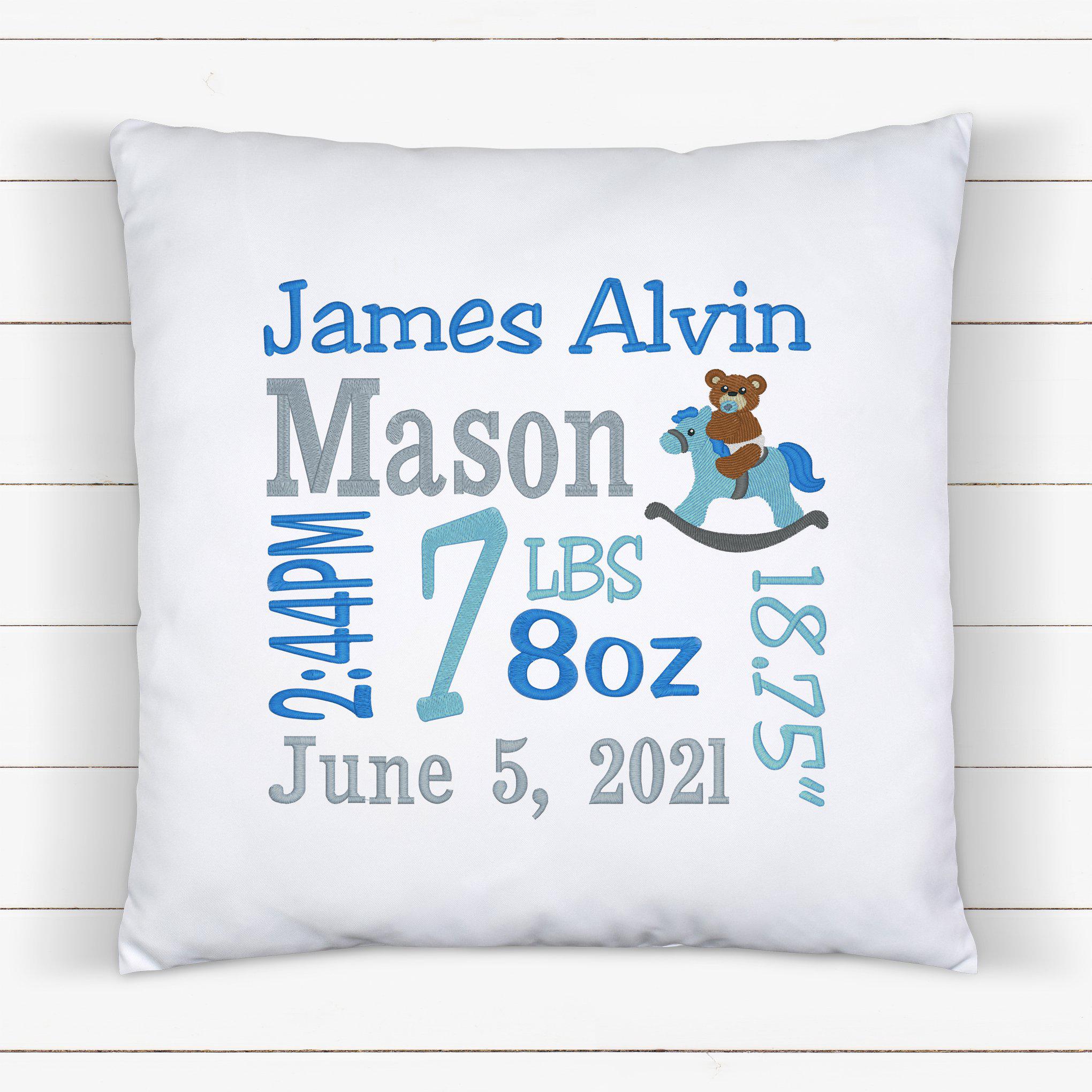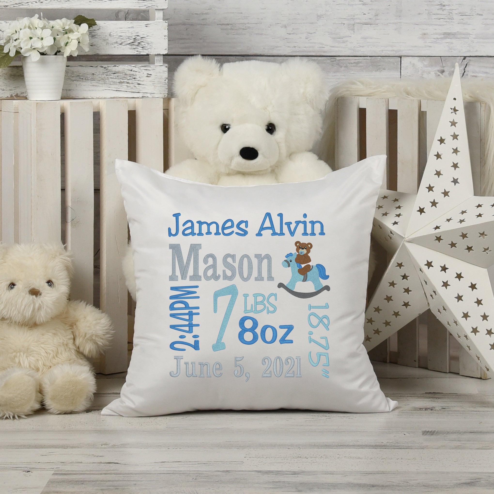 Personalized Birth Statistics Pillow - Embroidered Boy Rocking Horse Design