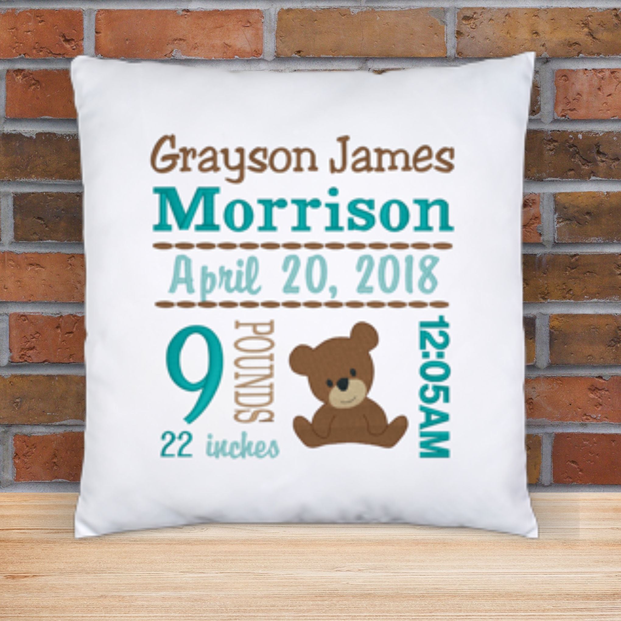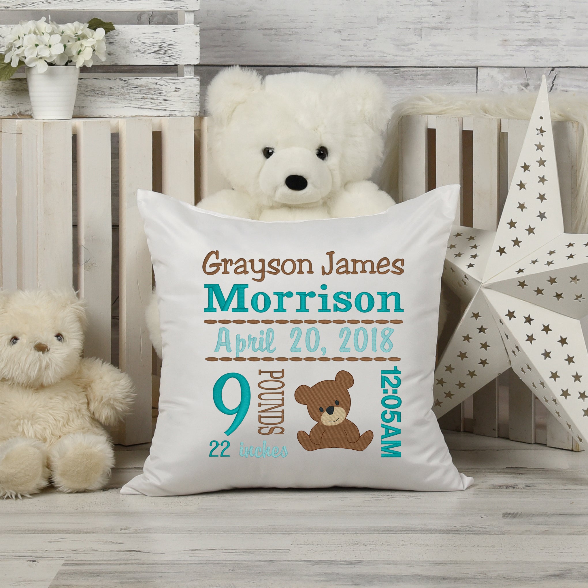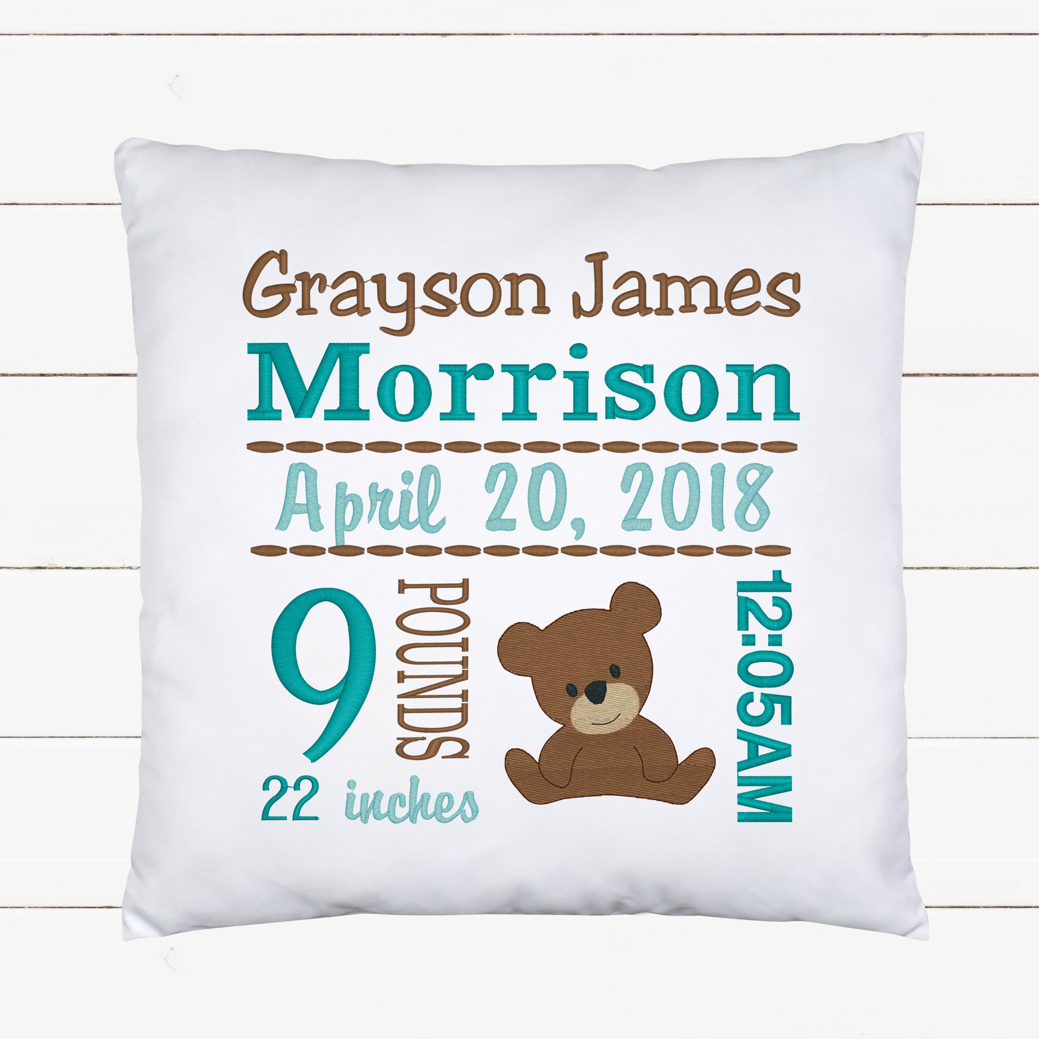 Personalized Birth Statistics Pillow - Embroidered Boy Teddy Bear Design