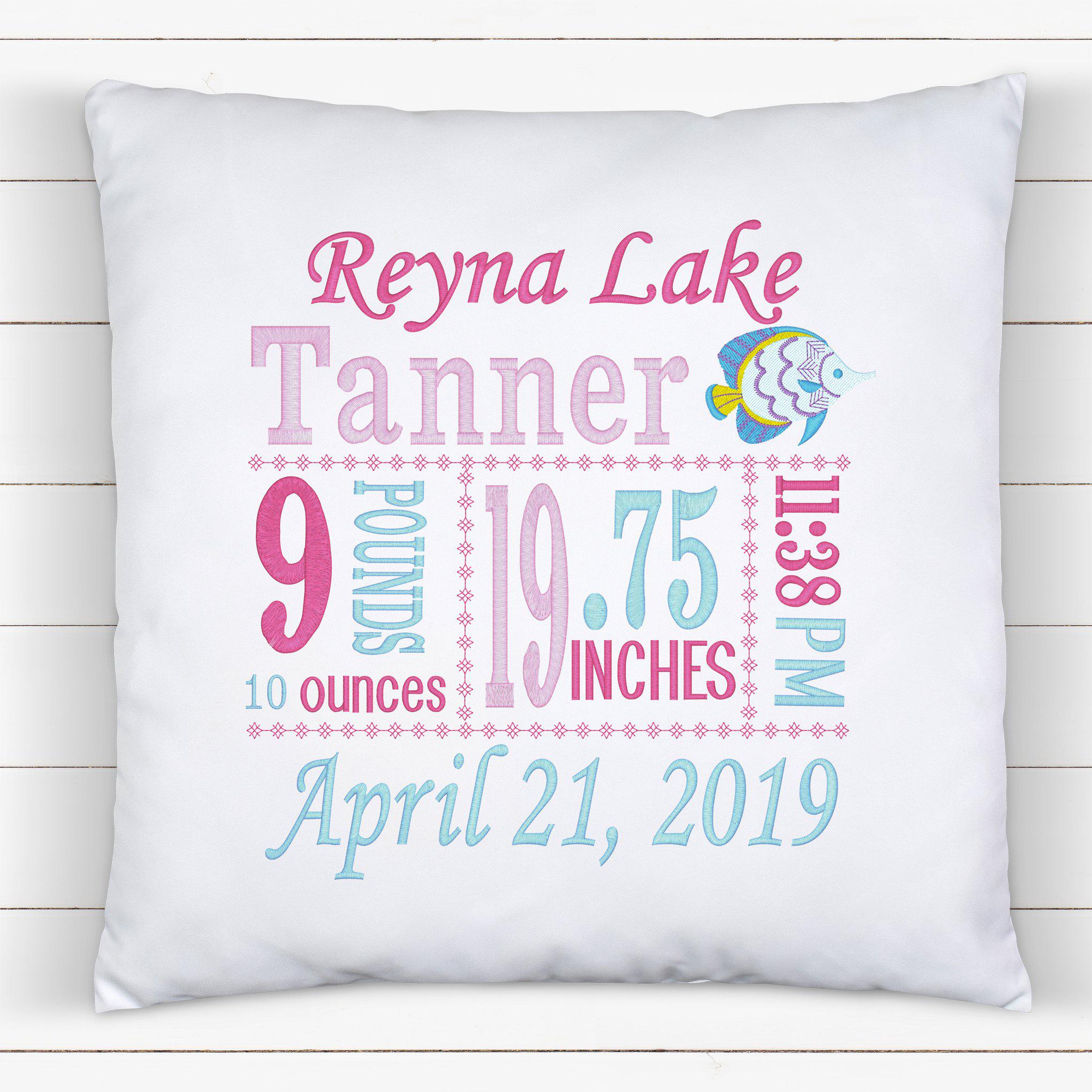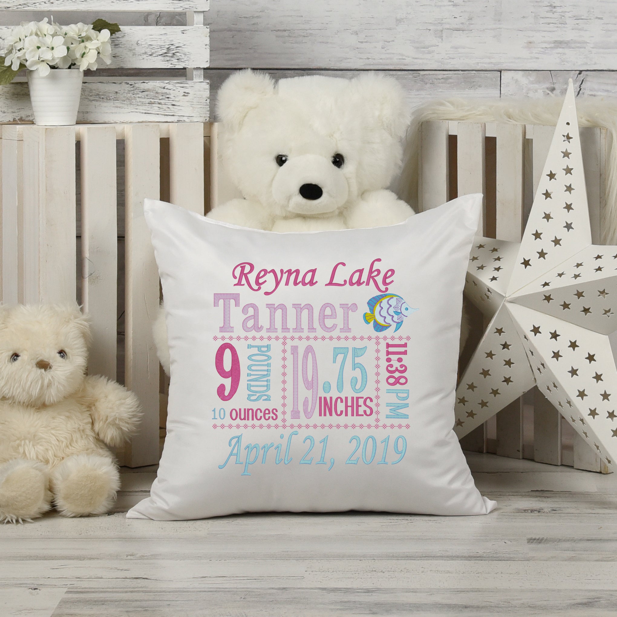 Personalized Birth Statistics Pillow - Embroidered Fish Design