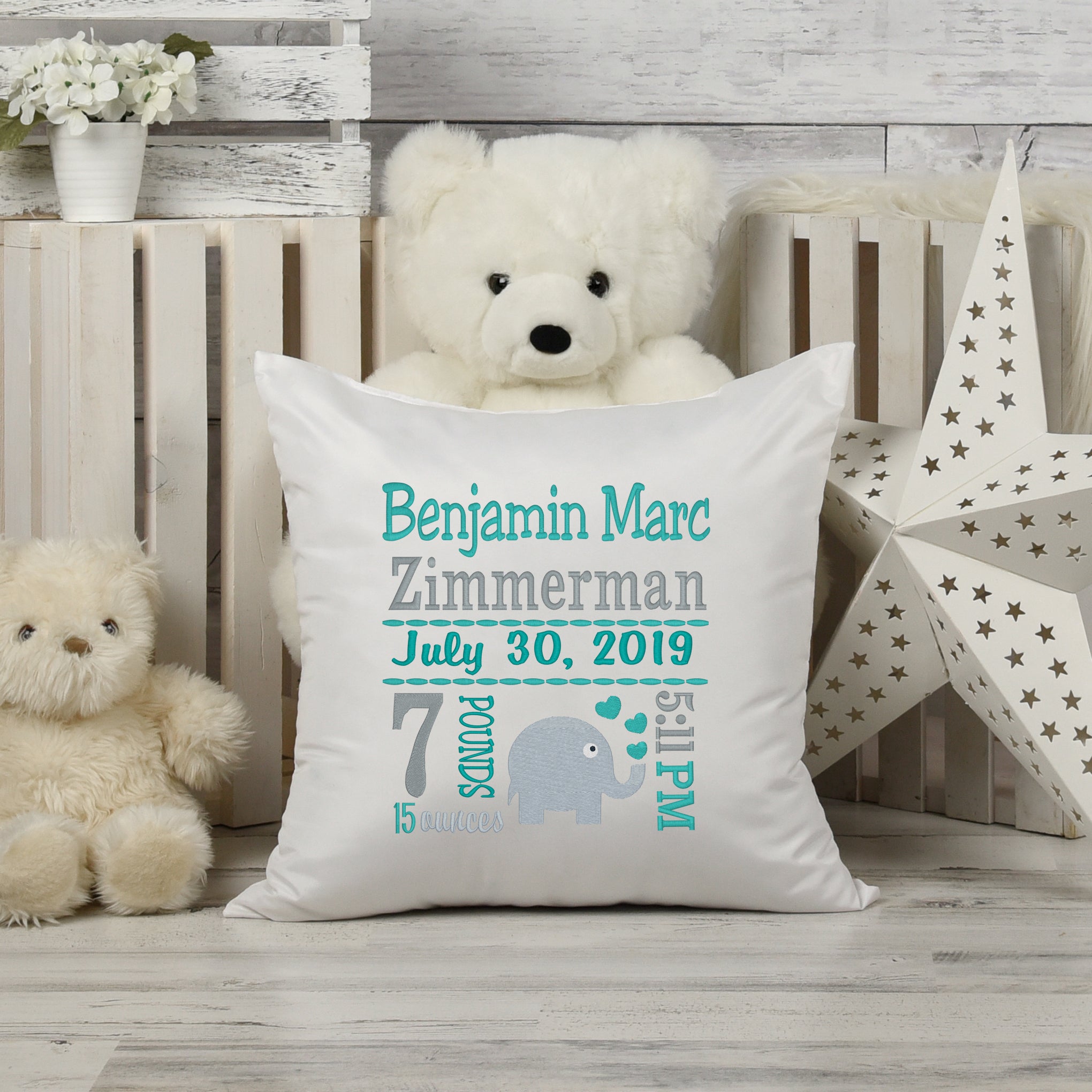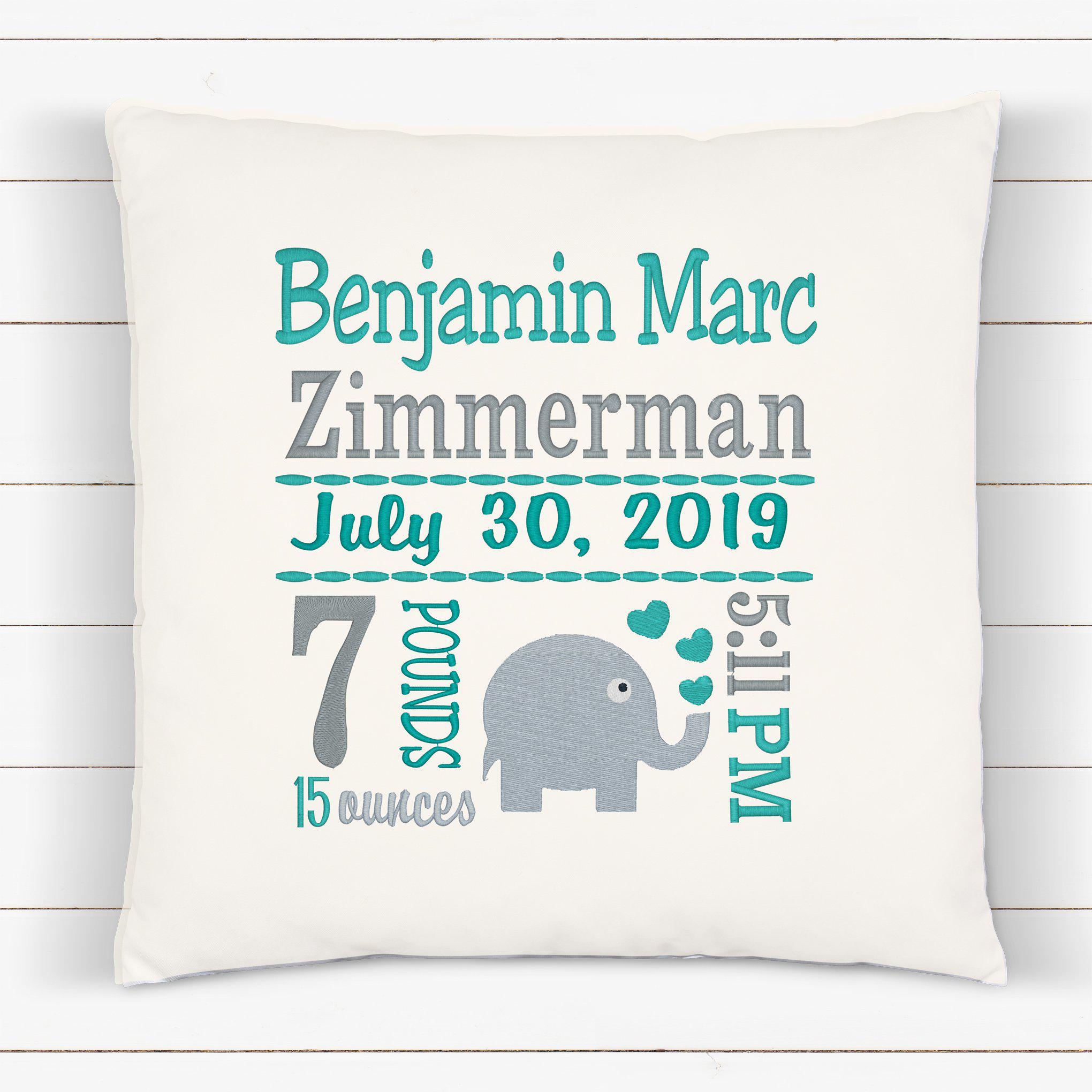 Birth Statistics Pillow - Embroidered Teal Elephant Design