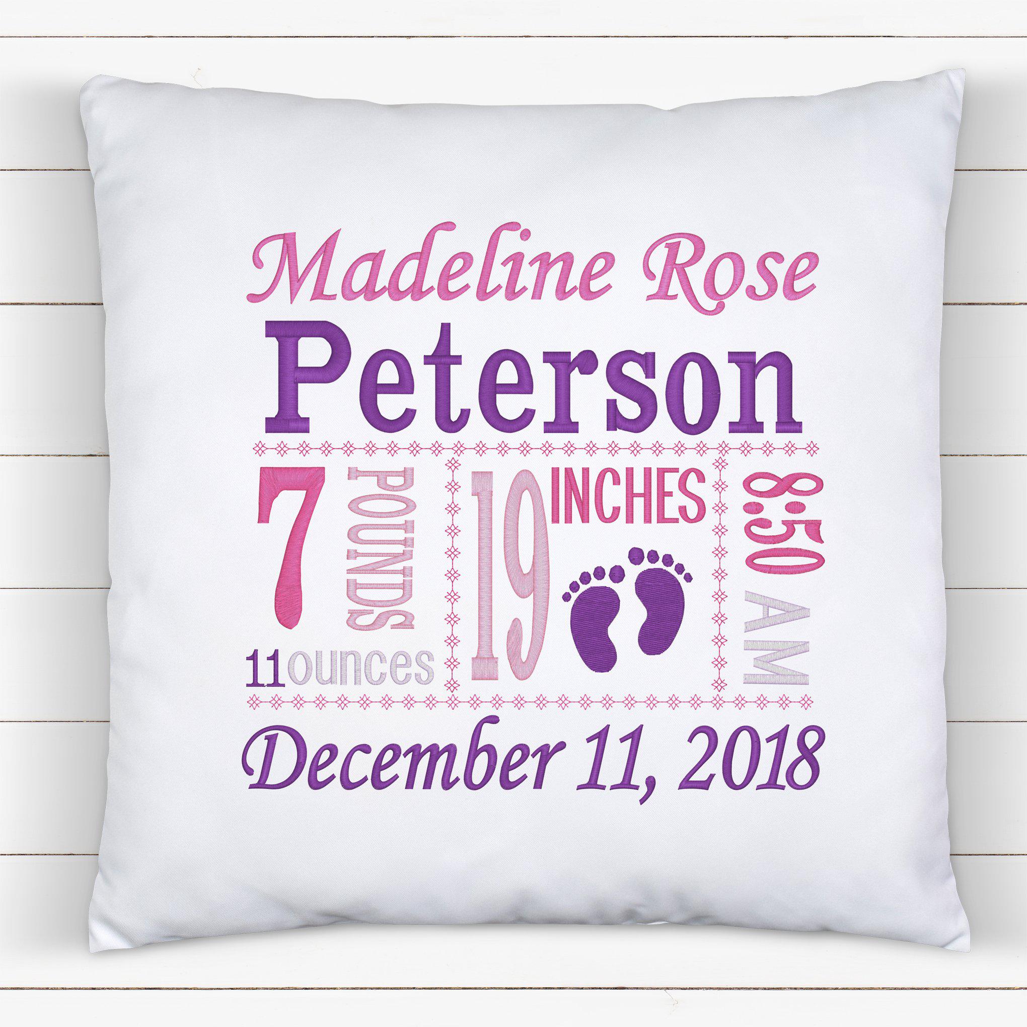 Personalized Birth Statistics Pillow - Embroidered Pink And Purple Design