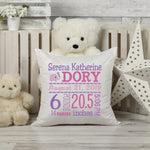 Personalized Birth Statistics Pillow - Embroidered Pink And Purple Design
