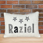 White chenille name pillow with gray and black appliqued letters and stars.