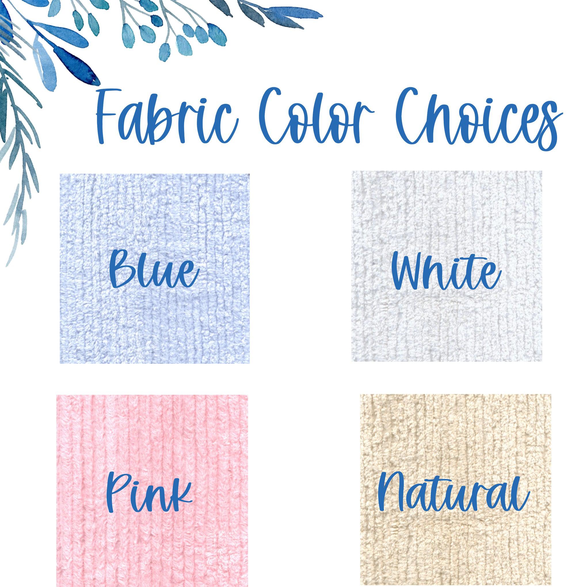 This pretty personalized pillow is made with soft chenille fabric. The name is appliqued with a variety of soft gray print fabrics (may vary due to availability). Your special one will love it!!