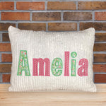This pretty personalized pillow is made with soft chenille fabric. The name is appliqued with a floral spring green/pink and pink dots fabrics (may vary due to availability). Your special girl one will love it!!