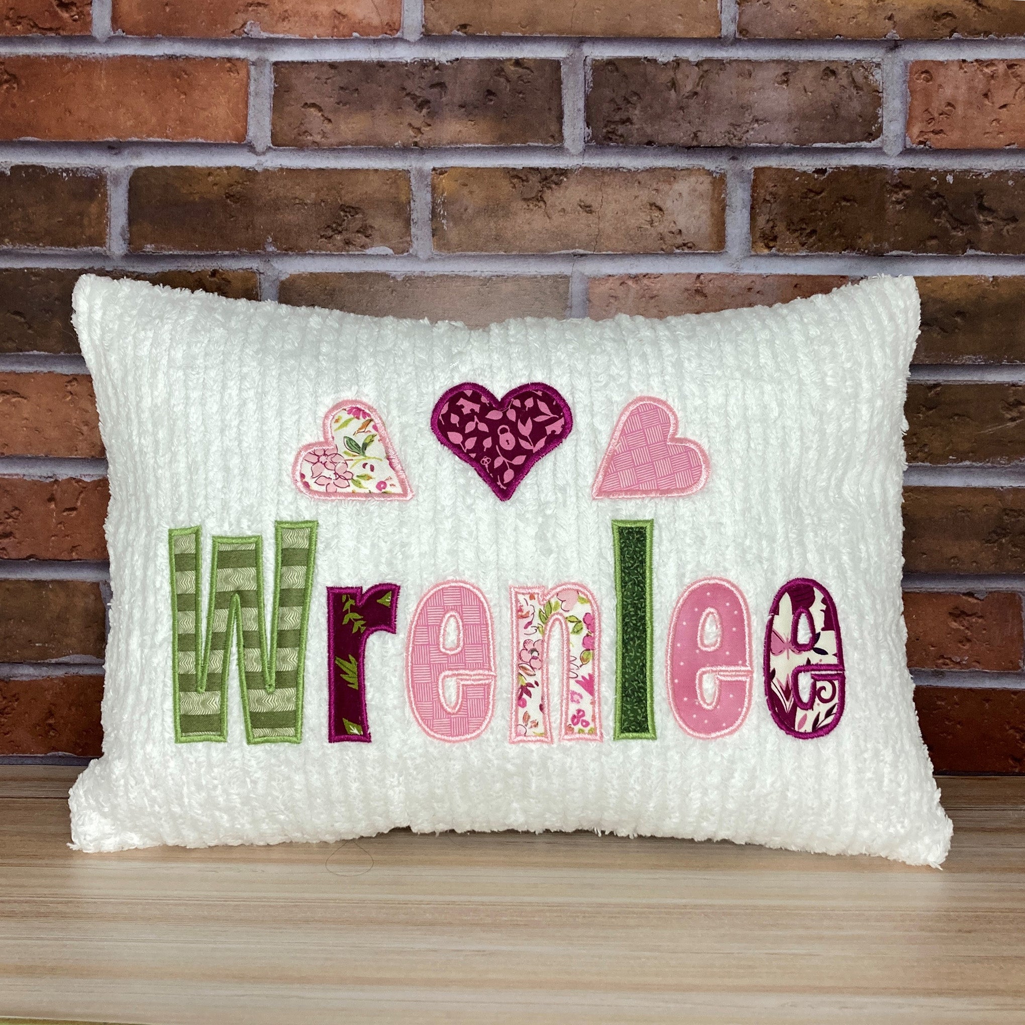 This pretty personalized pillow is made with soft chenille fabric. The name is appliqued with a variety of vintage pink, green and gold print fabrics (may change slightly from listing photo due to availability). Your special girl will love it!!