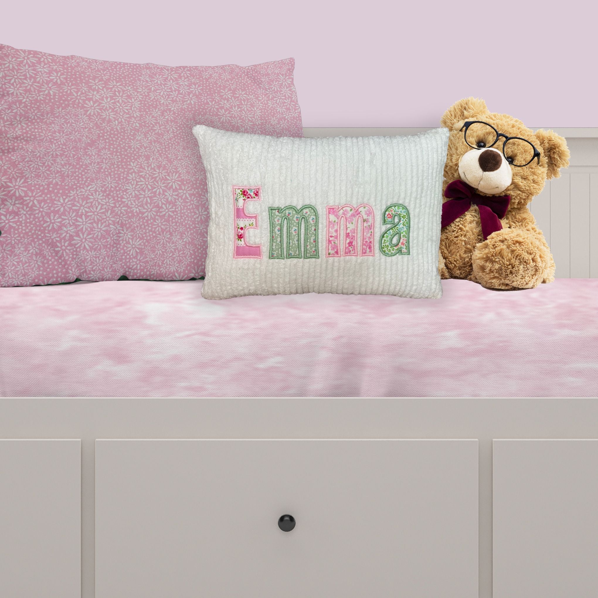 This pretty personalized pillow is made with soft chenille fabric. The name and hearts are appliqued with a variety of light to medium pink print fabrics (may vary due to availability). Your special one will love it!!