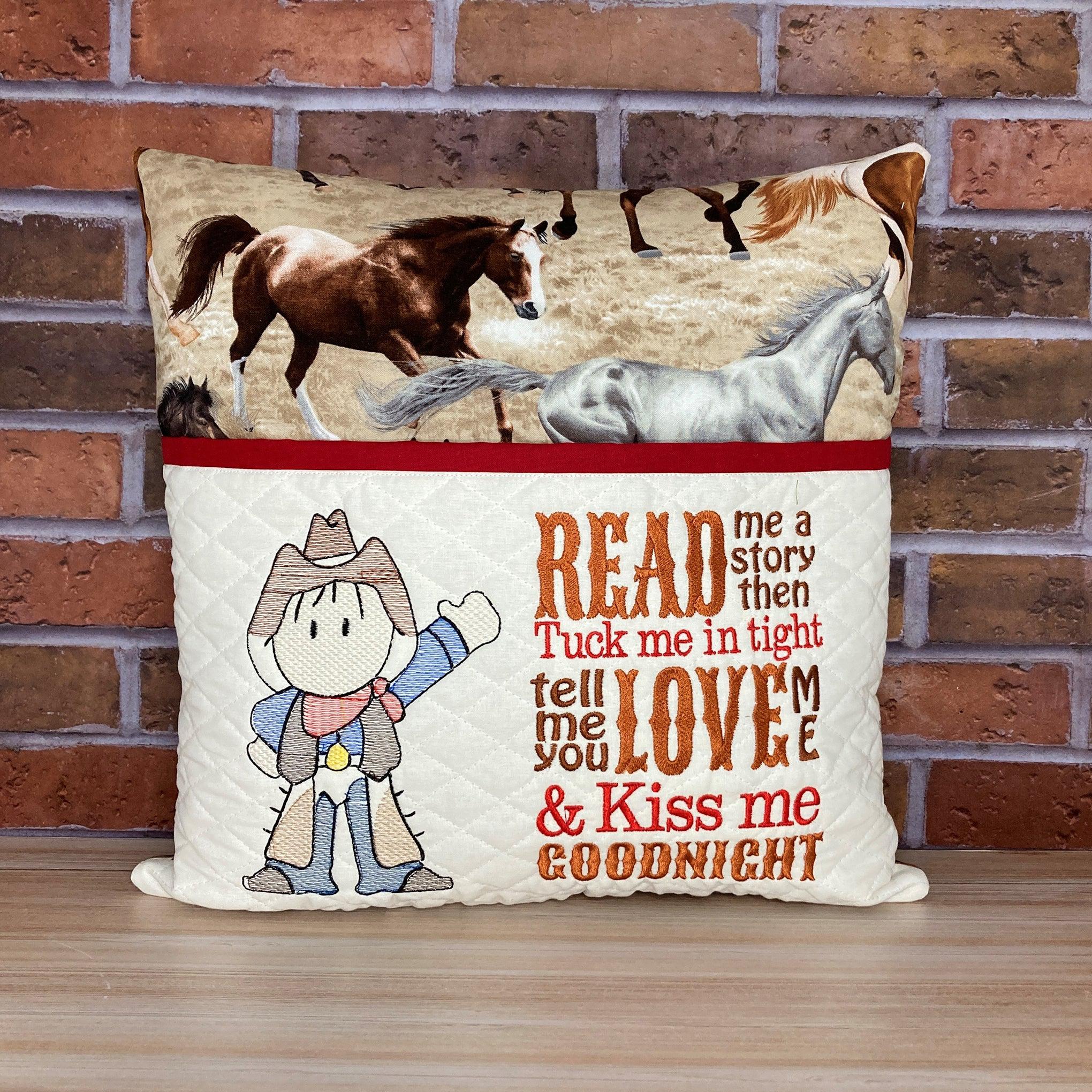 Encourage the young readers in your life with a special reading pillow. The adorable horses fabric and embroidered cowboy design is a great choice for a growing boy who loves to read. The front pocket is perfect for holding a book, e-reader, etc.