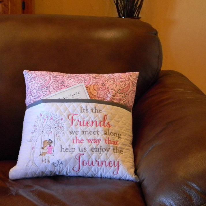 This beautiful pillow will be a cherished gift for your special friend, and uses a pretty pink and gray fabric and embroidery design. The front pocket is perfect for holding a book, e-reader, etc. The front pocket design and wording are embroidered.